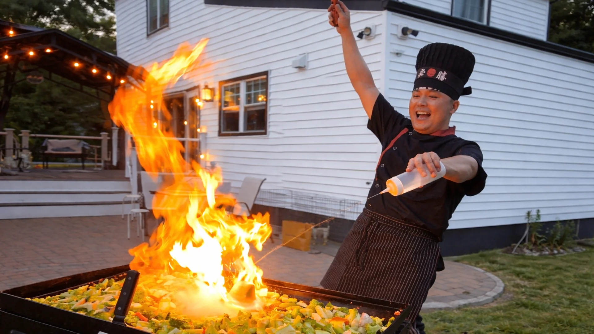 Live chef interaction and entertaining presentation during your in-home hibachi dinner.